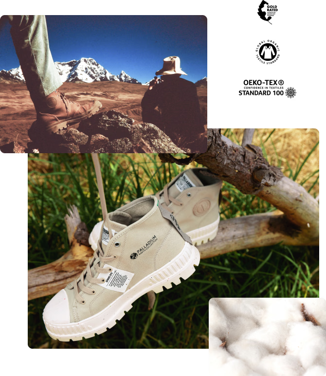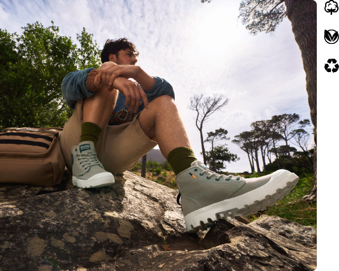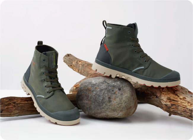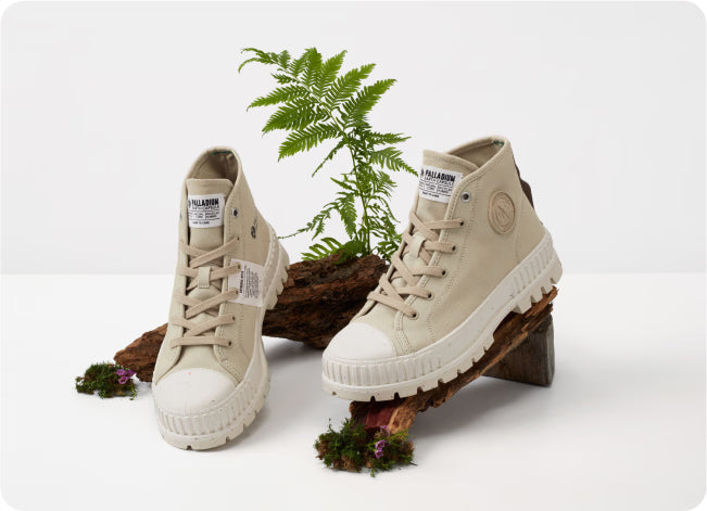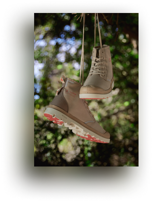 Championing diversity and nature, these iconic archive styles reflect innovative designs, sustainable materials, and our commitment to a better future. Two of Palladium’s iconic archive styles - Pallashock and Pampa - are reimagined in certified organic and recycled materials.
