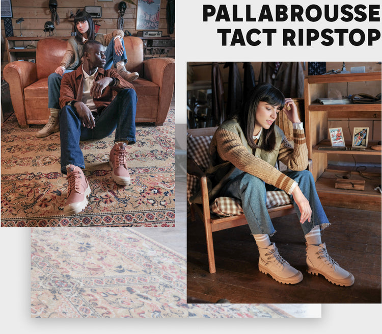 The Heritage collection offers a contemporary update with Pallabrousse Tact Ripstop style. A newly designed tactical upper featuring outdoor-inspired details such as lace hooks and a coated organic cotton ripstop upper.